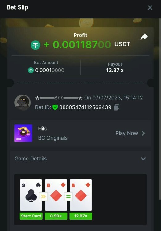 چالش 125 دلاری بازی هایلو / HiLo : چالش گرفتن بالاترین ضریب در بازی هایـــــلو و مجموع ضرایب ارسالے . هر ڪاربر مجاز به ارسال 2 اسڪرین شات مے باشد . مجموع 2 ضریب به اشتراڪ گذاشتہ شده ، به عنوان امتیاز ڪاربر در نظر گرفتہ خواهد شد : شرایط چالش حداقل پایہ شرط : مینیموم تمامے ارزها به جز جی بی - ✫ حداقل سطح ڪاربر : تمامے لول ها - ✫ حداقل امتیاز قابل قبول : 99 امتیاز مےباشد - ✫ : نڪات مهم ڪاربر مجاز بہ رد ڪردن ڪارتہا مے باشد .✪ از ارسال شاتہای اضافے و قدیمے برای هر ضریب ، خوددارے ڪنید .✪ ارسال لینڪ شرطہا بہ همراه شات اسڪـــرینہا الزامے مے باشد .✪ ادیت ریپلاے ها مجاز نمے باشد .✪ در صورت عدم رعایت قوانین فوق ،از چالش حذف شده و در صورت ارسال شات تڪراری ، آن ضریب لحاظ نخواهد شد .✪ در صورت تساوی امتیازات ، بازیڪنے ڪہ پایہ شرط اولیـــن شات ارسالے اش بیشتر باشد (از نظر دلاری) برنده خواهد بود . اگر در امتیاز و پایہ شرط ها هم مساوی باشند ، ڪسے ڪہ اولین شات خود را زودتر ارسال ڪرده است در رتبہ بندے بالاتر در نظر گرفتہ مے شود . ═══════ ◦ ★ ◦ ═══════ جوایز نفر اول : برنده 50 دلار نفر دوم : برنده 25 دلار نفر سوم : برنده 15 دلار نفرات چہارم و پنجم : نفری 6 دلار نفرات ششم تا یازدهم : نفری 3 دلار نفرات دوازدهم تا شانزدهم : نفری 1 دلار زمان پایان چالش : شنبہ 2 مہر / 24 سپتامبر ساعت 23:59 نمونه شرط ارسالی : https://hash.game/sd/?sd=10HXTS13ILFUOJ