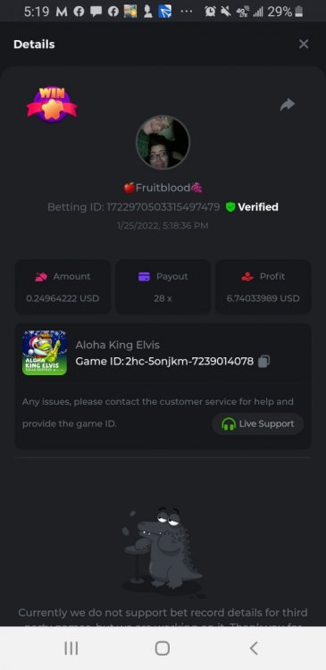 7. I doubt I grind now that the games aren't individual but are combined. Thought I got first for johnny cash last time and nah I'm 6th overall. Sucks that you cant grind a game you enjoy for top prize and ignore others anymore Fruit Super Nova 60: 60.0072x Betting ID:1723091347009896711 Epic Gladiator: 75.115x Betting ID: 1723186180794098560