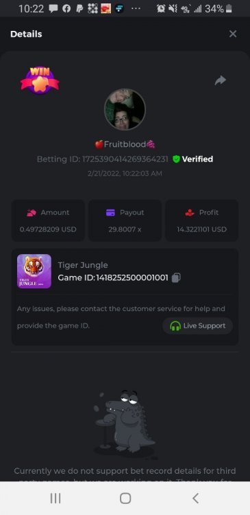6. I legit cant find my old post right now if I ever did make it. Sorry this one is the most recent. Hit the Gold! - 84.2x Bet ID: 1725389764861461767 Tiger Jungle - 29.8007x Bet ID: 1725390414269364231