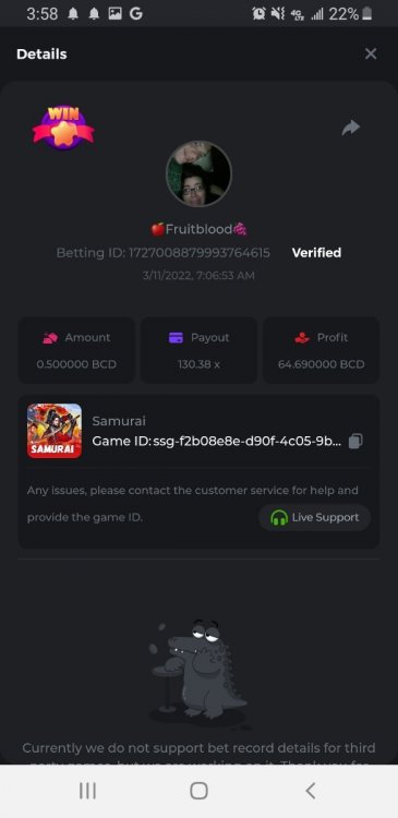 4. Niobium/Mr_Art I hope you guys take pity on me I apparently left my info as a note on my phone when I thought I had uploaded it here to the forum I cant be too upset. I didn't have the funds to really compete but I was proud and would be super duper grateful if you still counted it for the participation pool. I feel dumb lol I noticed when I added a note and checked forums to see I never moved it over Showing it was accurate and not edited since that day, the 11th. I uploaded the sword one and forgot the Samurai one 130.38x Samurai: https://bc.game/sd/?sd=10G3M8E4LHYN83